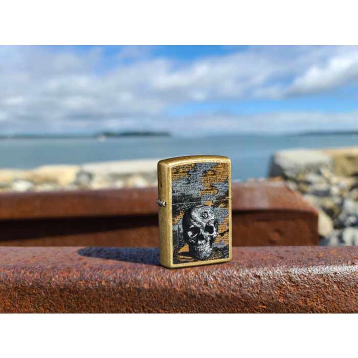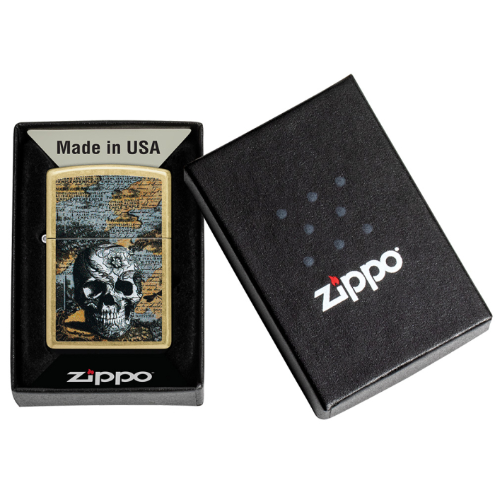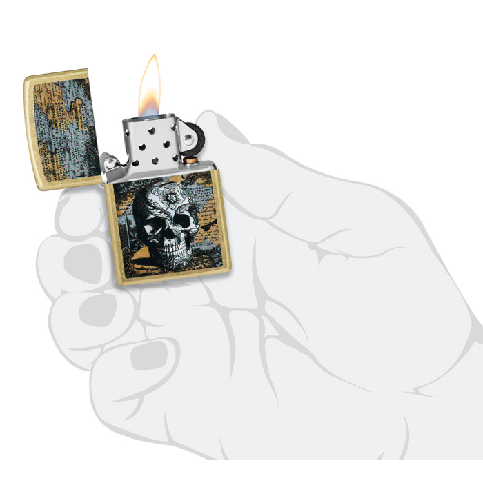 Složitá lebka s květinovými ornamenty v se nachází na mapě středověkých úvah na tomto Zippo zapalovači Street Brass v úžasném barevném designu.