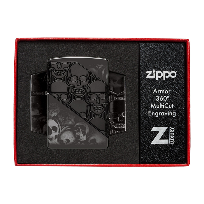 Nemůžete se rozhodnout pro styl lebky? Tento mrazivý Zippo zapalovač Armor® High Polish Black kombinuje hluboké frézování MultiCut se strašidelným designem Photo Image 360° pro dvojnásobnou hrůzu na každé straně. Dodáváno v dárkové krabičce.